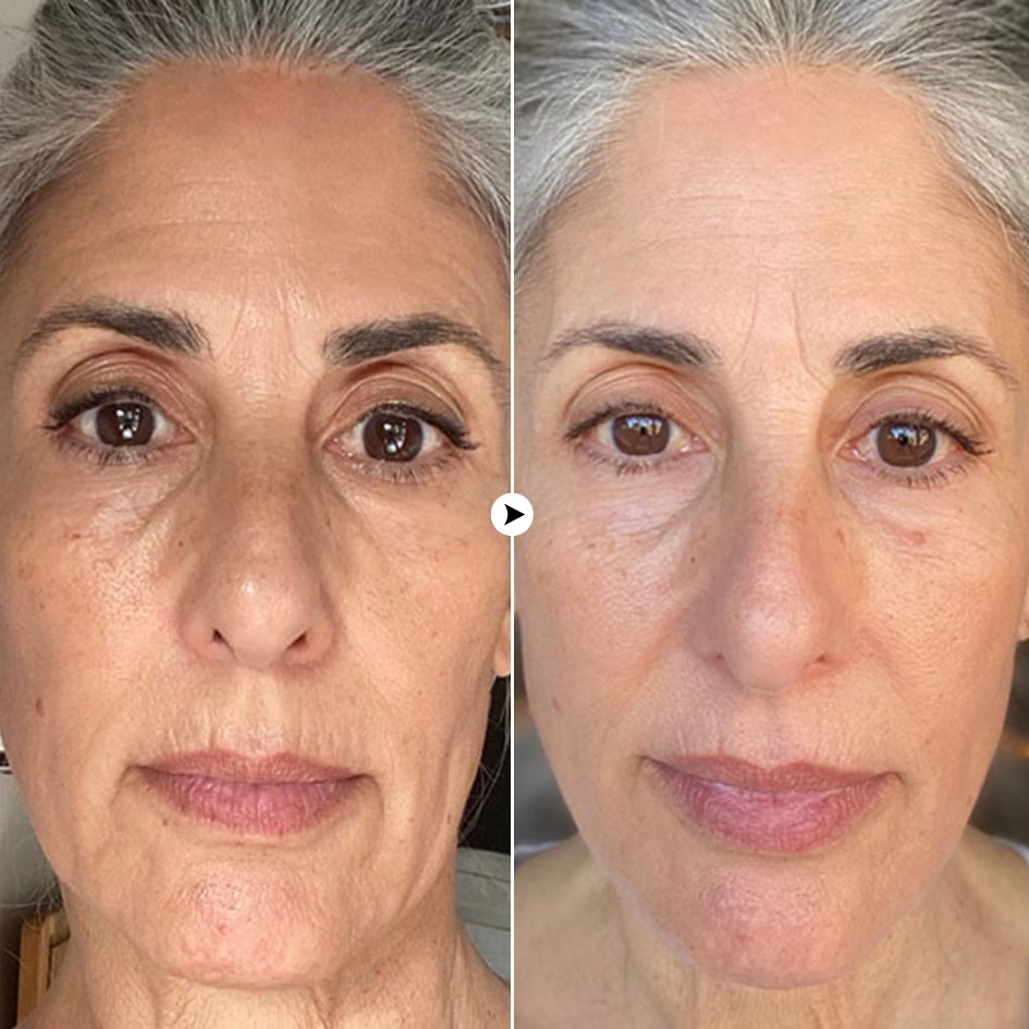 Wrinkles’ depth and length are significantly reduced, facial contours appear lifted and more defined. Skin feels plumper, firmer, and fully redensified.